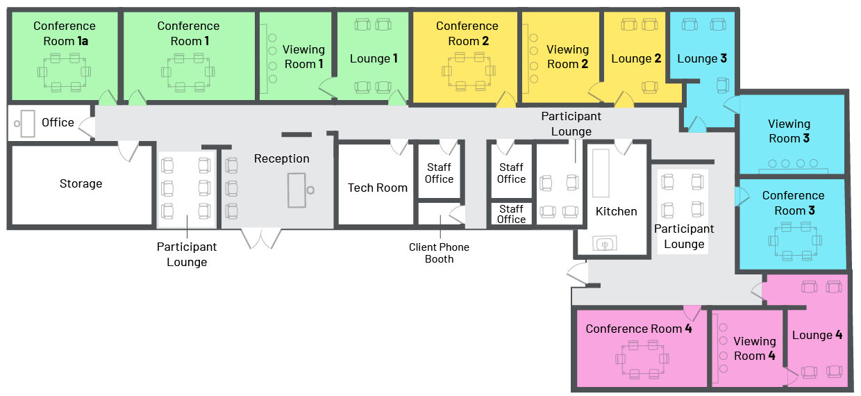 Ensure a smooth, organized experience with four separate waiting areas and a private back entrance ideal for mock trials, taste tests, and other specialized studies. Whether your project consists of focus groups or something more unconventional, we’ve got the space and the expertise to bring your research to life.